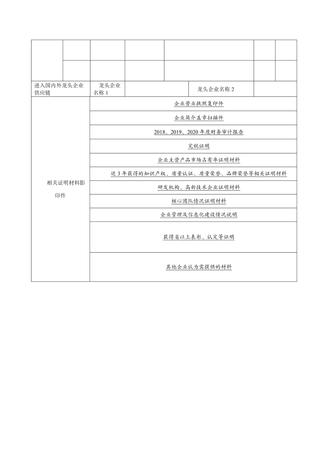 (三)除申報(bào)小巨人企業(yè)(創(chuàng)新類)外,須提供第三方機(jī)構(gòu)出具的產(chǎn)品市場(chǎng)占有率證明,或者由國(guó)內(nèi)外龍頭企業(yè)出具的進(jìn)入其供應(yīng)鏈體系證明。證明材料應(yīng)能反映企業(yè)主導(dǎo)產(chǎn)品在所屬細(xì)分領(lǐng)域的市場(chǎng)地位,國(guó)內(nèi)外市場(chǎng)的占有率及排名,具體格式不限。第三方機(jī)構(gòu)一般為省級(jí)以上行業(yè)協(xié)會(huì)、權(quán)威媒體及大型咨詢機(jī)構(gòu),無(wú)專門指定機(jī)構(gòu)。進(jìn)入國(guó)內(nèi)外龍頭企業(yè)供應(yīng)鏈體系證明材料,可以是供應(yīng)商資質(zhì)證明、供銷合同、往來(lái)財(cái)務(wù)憑證等近兩年內(nèi)的有效證明。完稅證明以稅務(wù)部門出具的相關(guān)材料為準(zhǔn)。企業(yè)須對(duì)提供各項(xiàng)材料的真實(shí)性負(fù)責(zé)。